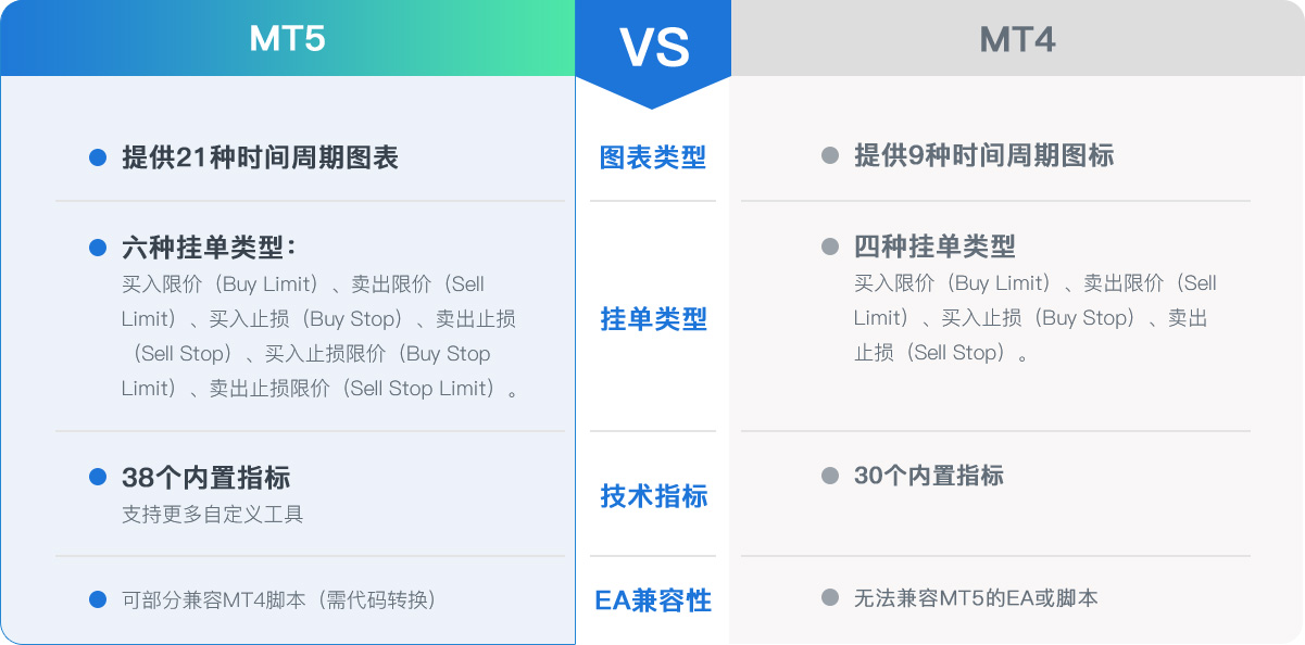 MT5是一个先进的多功能平台,可提供先进的自动交易系统,技术工具和复制交易。MetaTrader 5 旨在容纳更多资产类别上的高级交易,并使用大量先进工具。MT5快速灵活,非常适合希望利用更先进和可定制的交易工具的经验丰富的交易者。另外,MT5还支持浮动杠杆,它将按照您开仓数量以及可用保证金自动化调整您的杠杆比例。